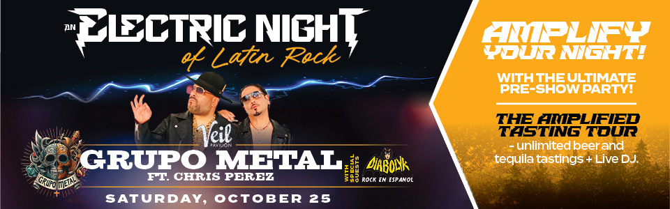 Turn up the volume and feel the heat as Grupo Metal featuring Chris Pérez performs live at Veil Pavilion with special guests Diabolyk -- Rock en Español!